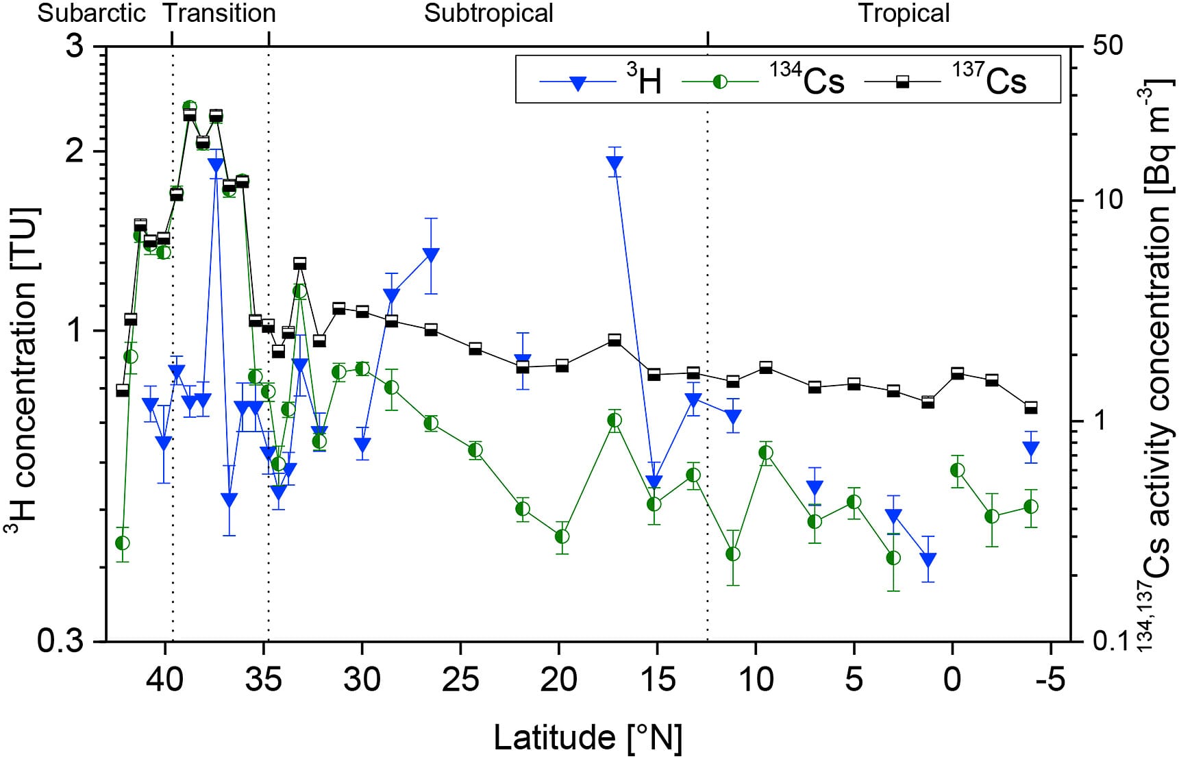圖二 福島事故後北太平洋西部水體中氚和銫137調查結果[7]