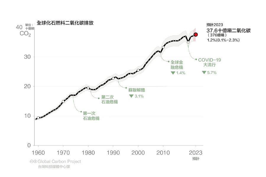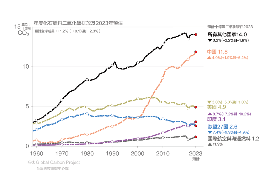 • 預計2023年,全球使用化石燃料產生的排放量將增加1.1%(範圍為0.0%至2.1%),達到368億噸二氧化碳(關於二氧化碳排放量的單位請參考:淨零與二氧化碳減量相關名詞解釋4、6),所有燃料類型(煤炭、石油、天然氣)的排放量預計都會增加。這使得化石燃料的​​二氧化碳排放量達到歷史新高,比2019 年COVID-19之前的水準高出1.4%。有26個國家的排放量正在下降,佔全球排放量的28%,其他國家的排放量成長正在放緩;重要的是,這些努力仍不足以扭轉全球化石燃料排放量的成長。