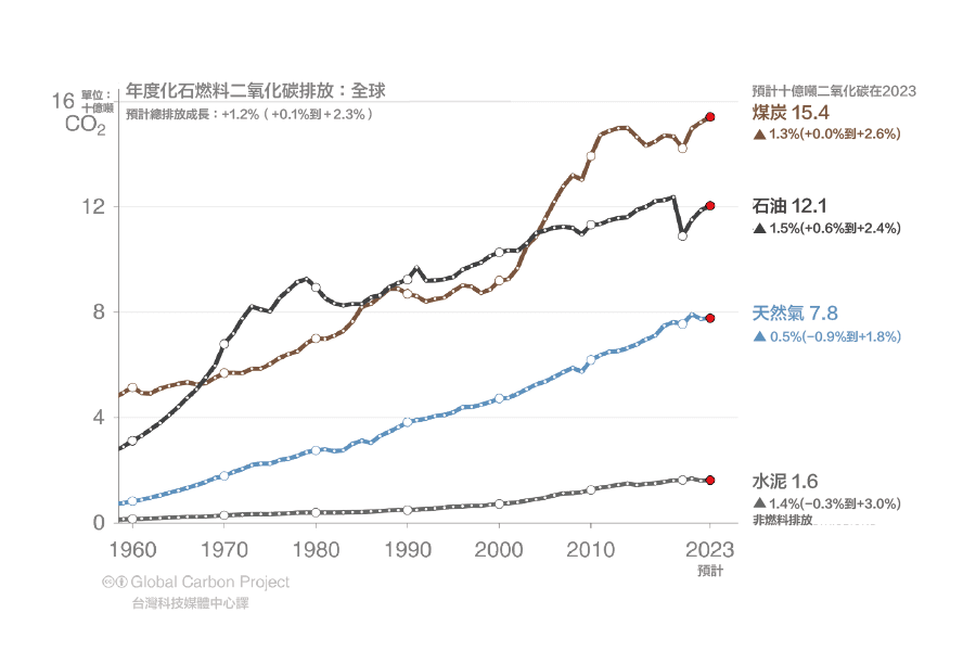 2023年的初步數據顯示,全球化石燃料二氧化碳排放量將創下歷史新高,較 2022年增加 1.1%(範圍為0.0%至2.1%),所有燃料類型的排放量預計都會成長。