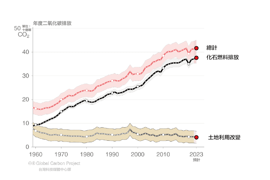 • 二氧化碳排放總量-過去十年間化石燃料和土地利用改變產生的排放量總和可能已趨於平穩,這與化石燃料排放量的小幅增長及土地利用改變的排放量小幅但具不確定性的下降密切相關。 預計2023年總排放量為409億噸二氧化碳。持續的二氧化碳排放導致大氣中二氧化碳含量進一步增加和全球持續暖化。