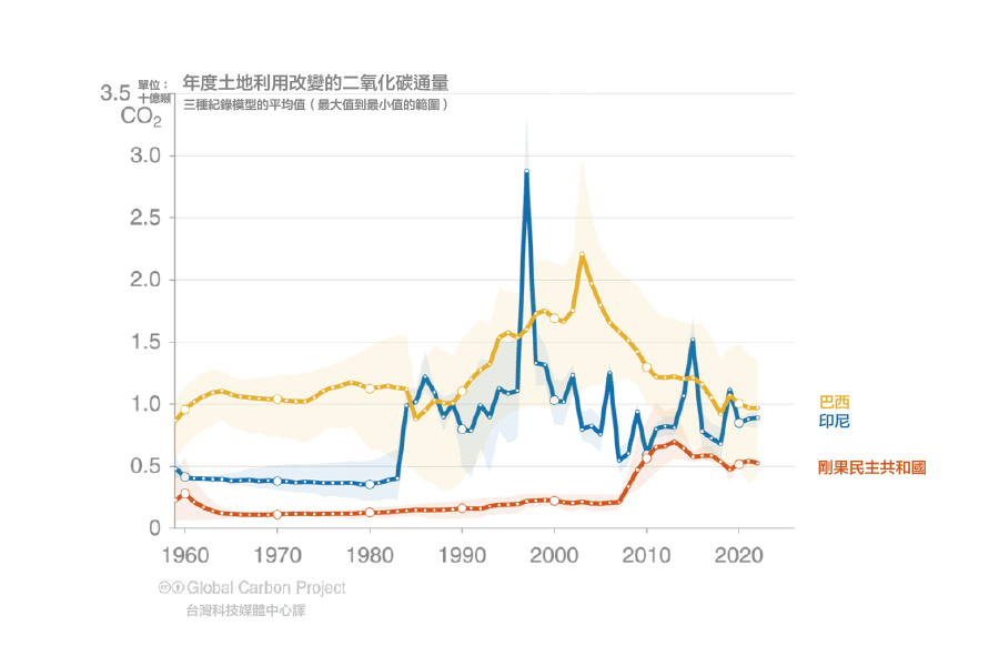 • 2013-2022年期間土地利用改變導致的二氧化碳淨排放量最高的是巴西、印尼和剛果民主共和國,它們合計佔全球土地利用改變二氧化碳淨排放量的55%。