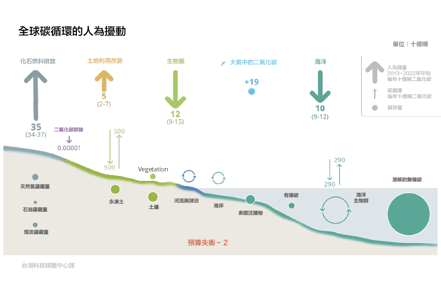 • 如果目前的二氧化碳排放量持續下去,則在7年內可就會超過將維持升溫限制在攝氏1.5度 50%可能性的剩餘碳預算,而在15年內可能會超出將升溫限制在攝氏1.7度的剩餘碳預算。在超過這些閾值後,若要使全球氣溫恢復到這些閾值以下,就需要在達到全球淨零排放後大幅擴大二氧化碳移除規模。