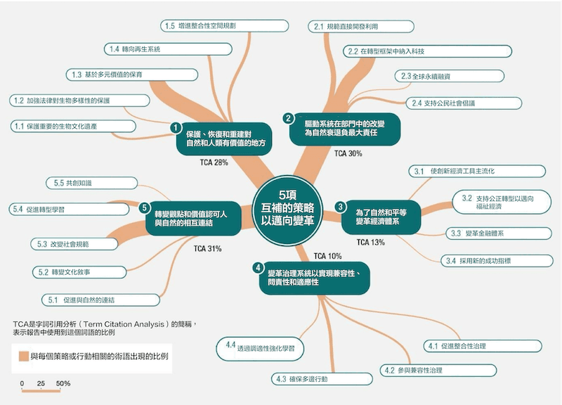策略5:聚焦於轉變社會觀點和價值觀,認識並優先注重人與自然間根本的內部連結。共創知識和協作可以貫徹這些策略,確保有效的知識交流並承諾多元和包容的原則。